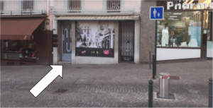 La montée se situe entre un chocolatier et une pharmacie.